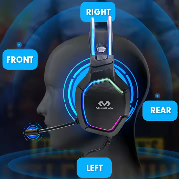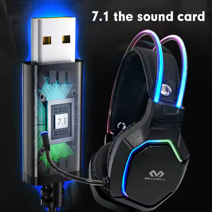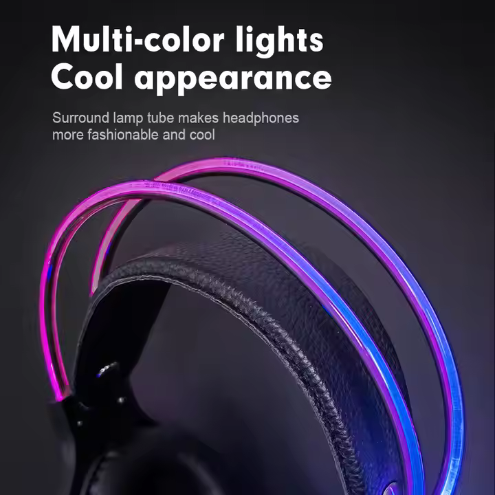 A professional gaming headset featuring virtual 7.1 surround sound for immersive audio. It includes an adjustable noise-isolating microphone, multicolor RGB lighting for a dynamic gaming atmosphere, and a durable over-ear design for extended comfort. Compatible with PC, gaming consoles, and mobile devices via a 3.5mm + USB connection.